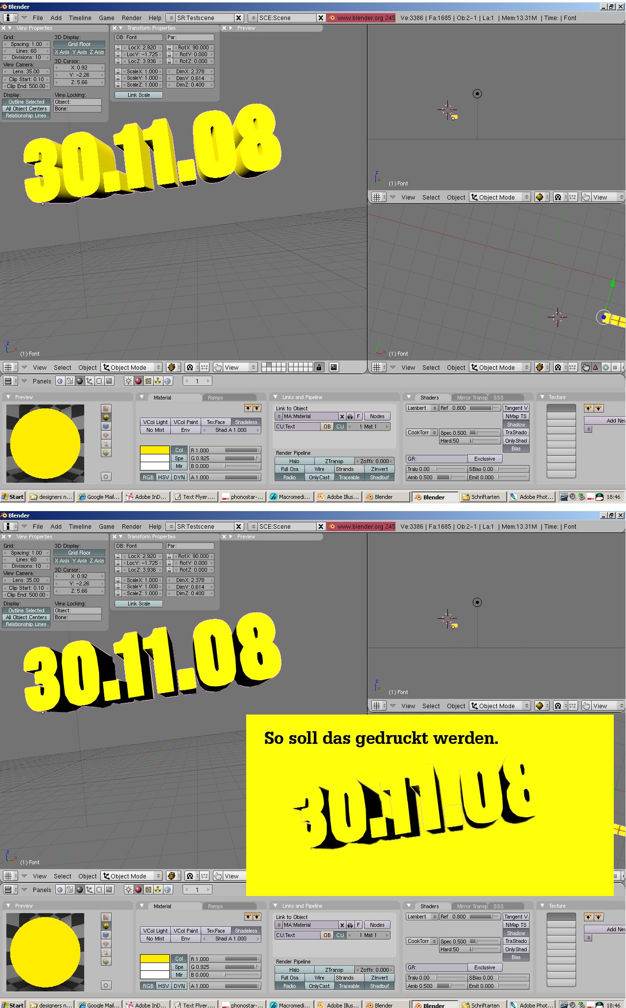 Dann könnte ich das ganze ja auch in freehand oder illustrator machen. Das Problem ist da aber, dass ich nicht mehrere Textblöcke in der selben Perspektive behandeln kann. Das will ich aber, weil die Sache dann richtiger ausschaut. (Die einzelnen Textblöcke muss ich immer extra extrudieren. Und dann wirds auch schwierig mit dem rotieren.) Dann ist mir die Kamera sympatischer. Da kann ich auf Entdeckungstour nach neuen Perspektiven gehen und die Brennweite verändern wie und wann ich will.
