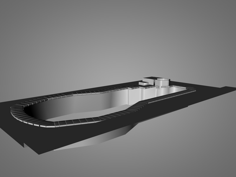 Wie schon erwähnt,erst einmal kam bisher nur C4d zum einsatz.Die komisch anmutenden Teile auf dem Becken sollen Fließen werden.Den Fußboden selbst habe ich schon einmal einen tritt nach unten gegeben.Ob das dann auch so im Final ist weiß ich im Moment noch gar nicht.Da lasse ich mich überraschen.