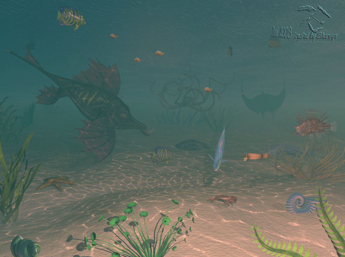 Caustic erstellt mit Causticgenerator , habe hier eine schwarzweiße verwendet , Muschel und Schnecke mittels Replikation erstellt und texturiert. Ich wollte unbedingt das Unterwasserpferdchen mal in einem Bild einbauen , daher gänzlich Fantasy , da es manche Fische gibt, manche Kreaturen halt nicht .