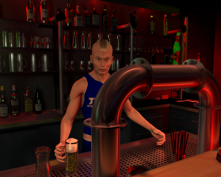 Hier eins der ersten Renderings meiner virtuellen Bar: Der Barkeeper bei der Arbeit.