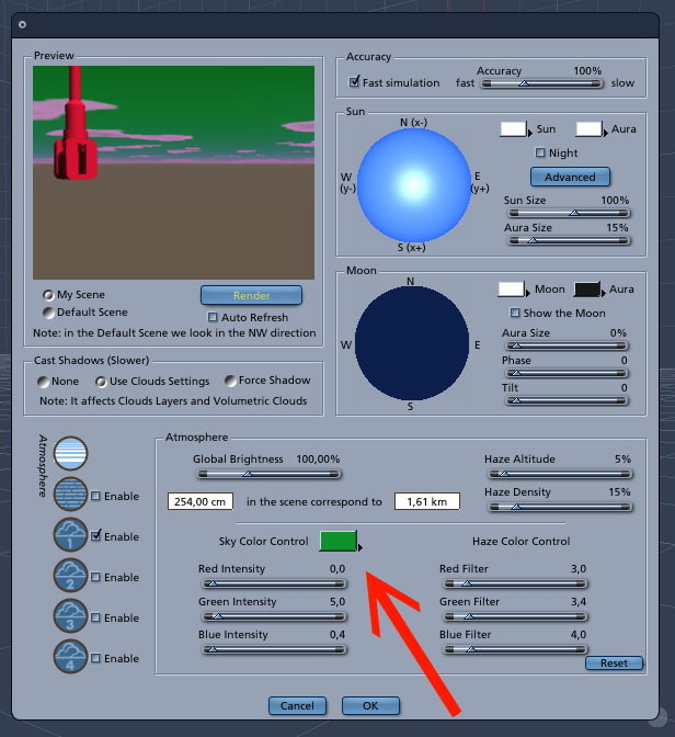 Also zuerst im Assemble Room auf Scene klicken, und oben bei Atmospere auf Realistic Sky gehen (das kennst du ja schon) und dann auf den Edit Button klicken, und im darauffolgenden Dialog die Farbe bei Sky Color ändern fertig.