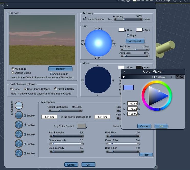 normalerweise arbeite ich mit Hintergrundbildern, manchmal mit aber auch mit dem CARRARA Himmel. Kann mir jemand erklären, wie ich die Himmelfarbe im realistic sky definieren kann? bei mir kann ich zwar im Farbenrad ein schönes blau wählen, aber die angezeigte Farbe springt sofort in ein häßliches Graublau. ( aktuelle Version)