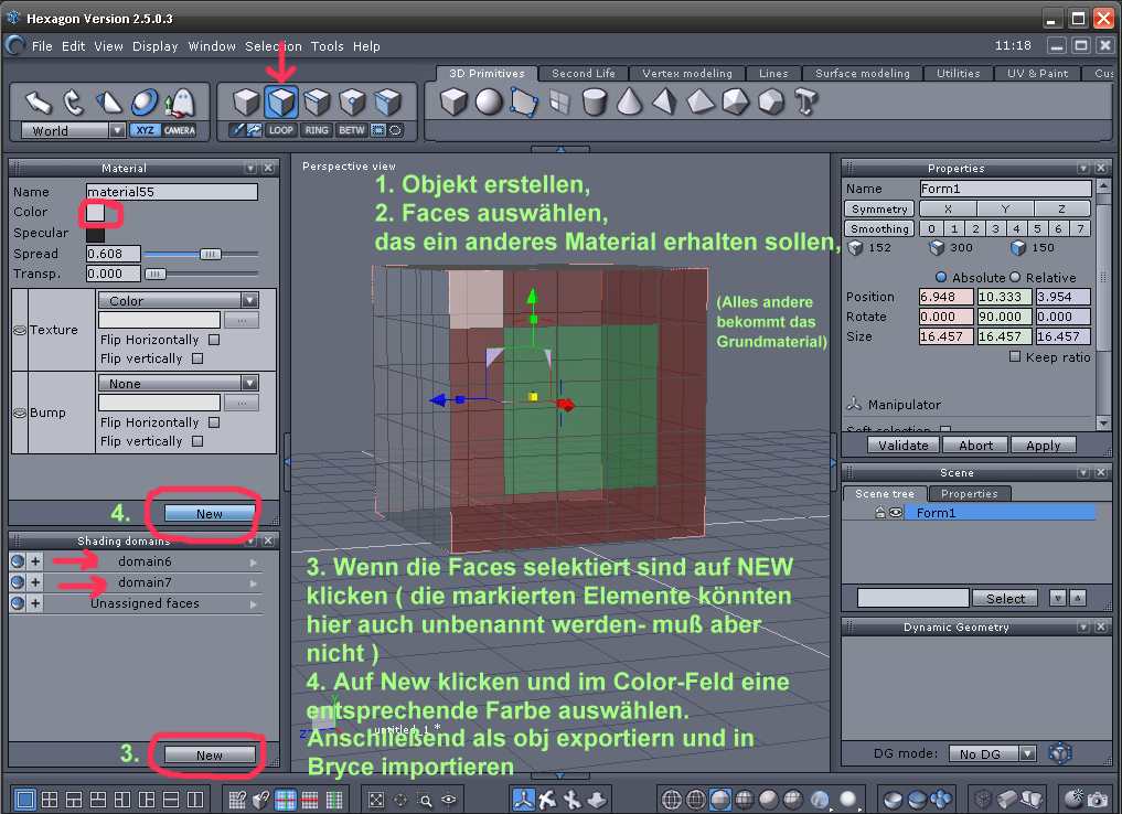 Du kannst einem Objekt, welches aus mehreren Einzelobjekten besteht, verschiedene Materialien zuweisen. Ebenso kannst du einem Einzelobjekt mehrere Materialien zuweisen. Du mußt nur die Faces markieren, die ein anderes Material bekommen sollen. Anschließend in Shading Domains auf NEW klicken und dann in Material auf NEW klicken. Im Material Fenster in Color kannst du den Faces eine neue Farbe geben. Du solltest zur besseren Übersicht den verschieden ausgewählten Faces jeweils eine andere Farbe geben.