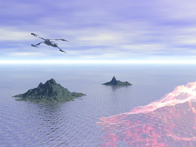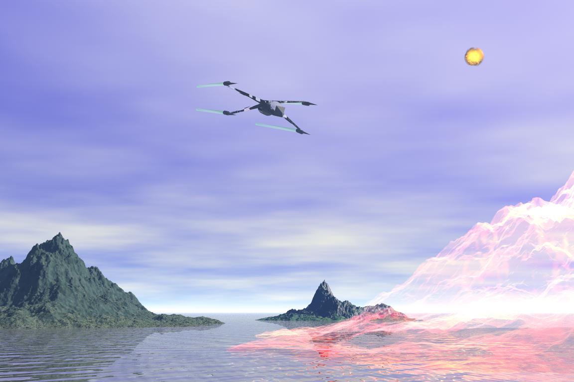 Man hätte auch die Kamera mehr an die Wasseroberfläche stellen und sie höher drehen können. Dann noch näher ran an die Inseln, so dass das Raumschiff größer über den Inseln zu sehen wäre. Das würde dem Bild noch etwas mehr Dramatik verleihen.