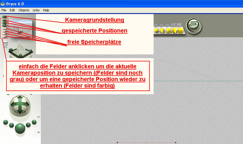 Bryce hat da ja die Möglichkeit die Kameraposition zu speichern. Da kann man neues probieren und die Kamera mit einem Klick wieder zurück setzen. (siehe angehängter Screenshot)