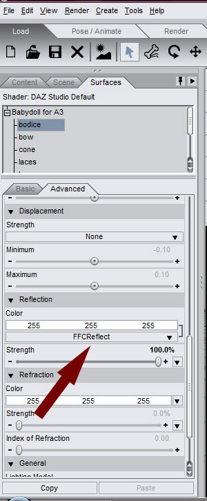 • Sector im Surface-Tab unter Advanced die Werte bei "Specular" für "Glossiness" und "Strength" jeweils auf 0 setzen, bei "Reflection" ebenso "Strength" auf 0 setzen.