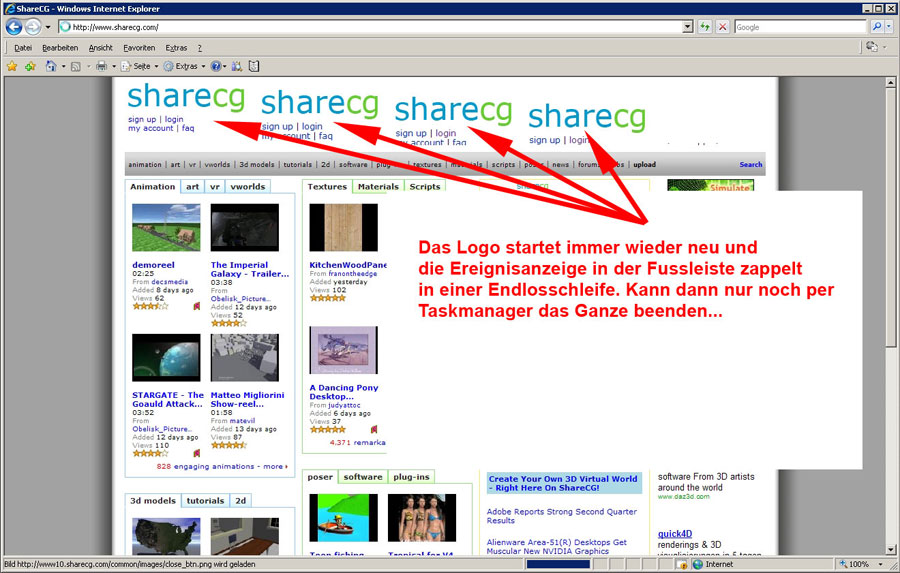 wär mal bitte Jemand so freundlich nachzusehen ob ShareCG.com auch Euch beim Besuch der Website ne Endlosschleife liefert oder ob das nur an meinem Server liegt...? Hab da seit Tagen das Problem dass ich nix uploaden kann, generell kaum an meine eigenen Freebies dran komme und auch beim switchen innerhalb der Seiten ist es ein sich immer wiederholender Versuch die Seite neu aufzubauen...