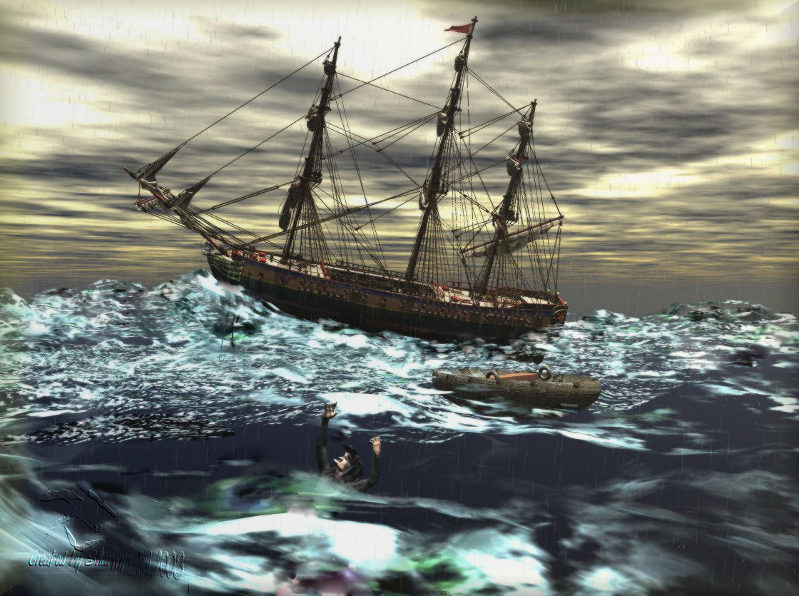 Das Bild hat insgesamt in den letzten Tagen 15 std gerendert , DAs Wasser besteht aus 24 Terrains in Schichten mal mit normaler Wassertex , mal mit schaumiger texturiert , habe als Terrainform hier Mordor gewählt aber an den Seiten etwas geglättet also Ränder rund gemalt . Himmel Selfmade , Regen auch Bryce . Da mir der aber nicht heftig genug erschien hab ich noch einmal in PI etwas nachgeholfen.