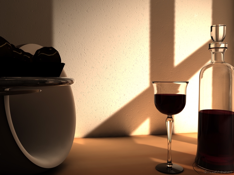• Schänes Bild, die Lichtbrechung von Wein ist leider schwierig, weil es ja nicht einfach nur eine Flüssigkeit ist sonder auch kleine Schwebeteilchen enthält. Da hast Du Dir ein schwieriges Material ausgesucht ;)