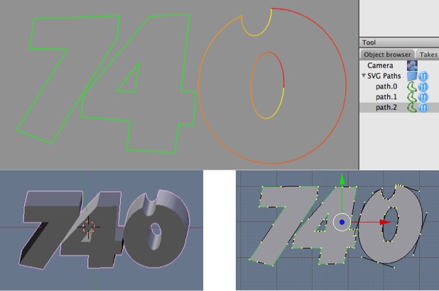 Wenn Du die Pfade als "Seperate Curves" importierst werden die Kombinationen leider wieder aufgelöst - deshalb meinte ich, dass Du wohl nicht drum herum kommst die Pfade in extra Dateien auszugeben und nacheinander zu importieren. Das liegt am Importer - den würde ich mal als unterentwickelt bezeichnen, denn die gleiche svg kommt in Cheetah3d fein säuberlich mit getrennten Buchstaben rein.