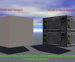Wie kommt es aber dann, daß ich zwei Würfel in Bryce gerendert habe, wobei der linke Würfel in Hexagon erstellt ( .obj Datei ) und der rechte in Bryce erstellt wurde und beide texturmäßig völlig verschieden aussehen.