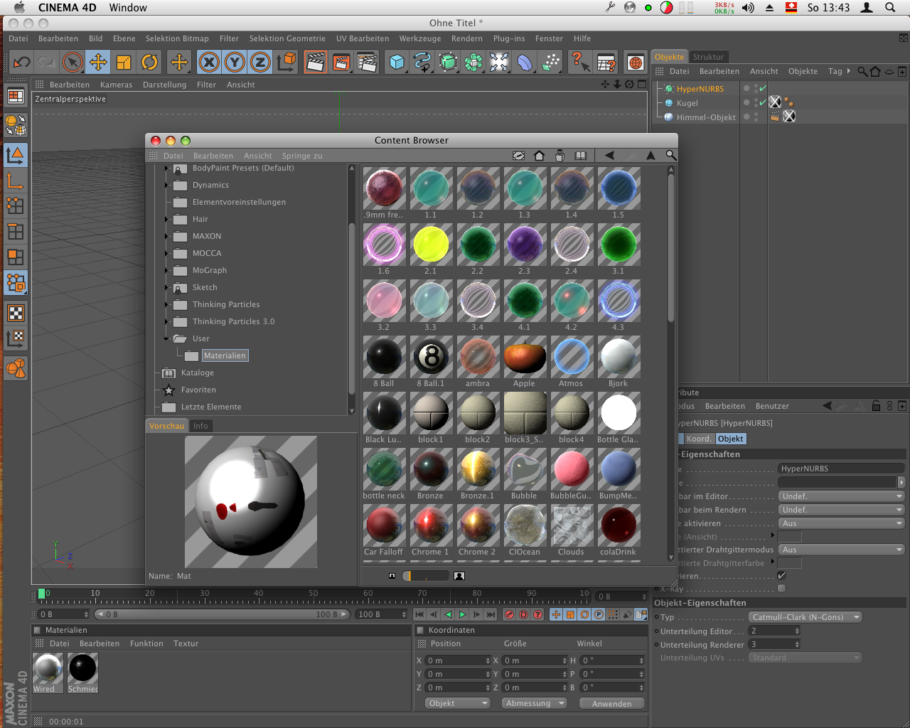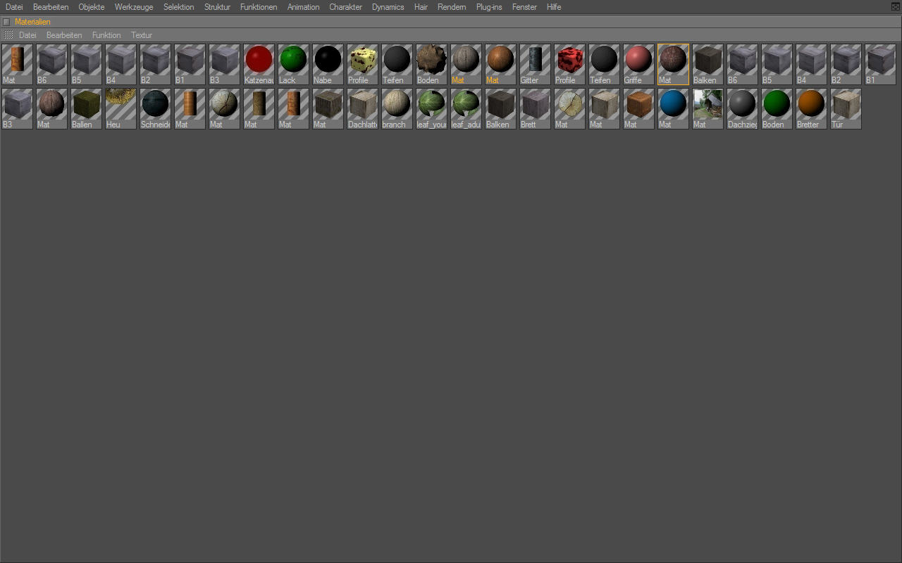 Ja schon aber ich habe viele Dateien mit "Material Preset speichern" gespeichert und das scheint alles in eine Datei zu pferchen: /Applications/CINEMA 4D R10/library/browser/user.lib4d Diese user.lib4d kann man nicht in einem Streich laden. Hab ich wohl was falsch gemacht. Wie ordnet Ihr Euere Materialien? Macht Ihr jedesmal ein c4d File daraus, so wie oben von nik abgebildet? Oder gibts was schlaueres wie bei Vue z.B?