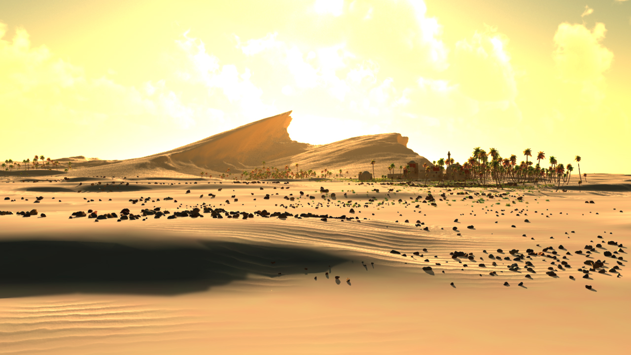 Die Distanz im Vordergrund sind nicht so genau zu lokalisieren. Die Steine sagen eigentlich nichts über die Distanz. Es kann sein dass man auf diesem Bild hoch über dem Wüstenboden schwebt, oder auch nur 10 m ungefähr.