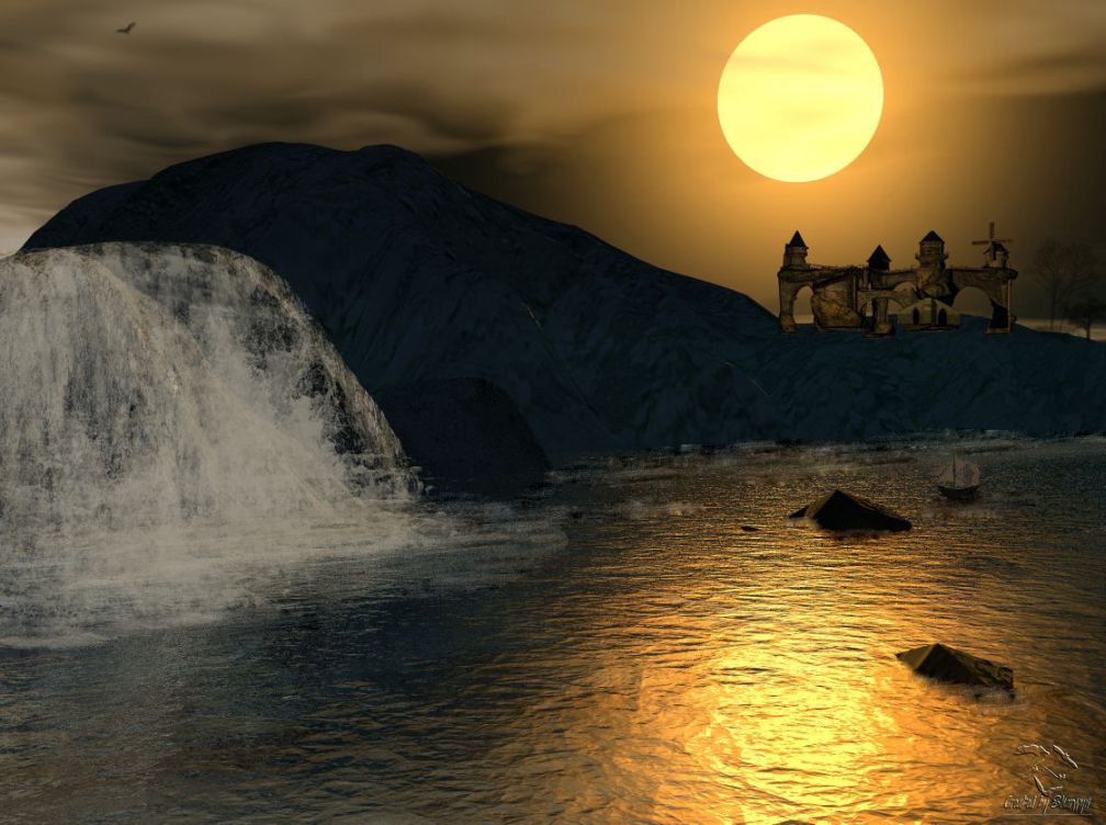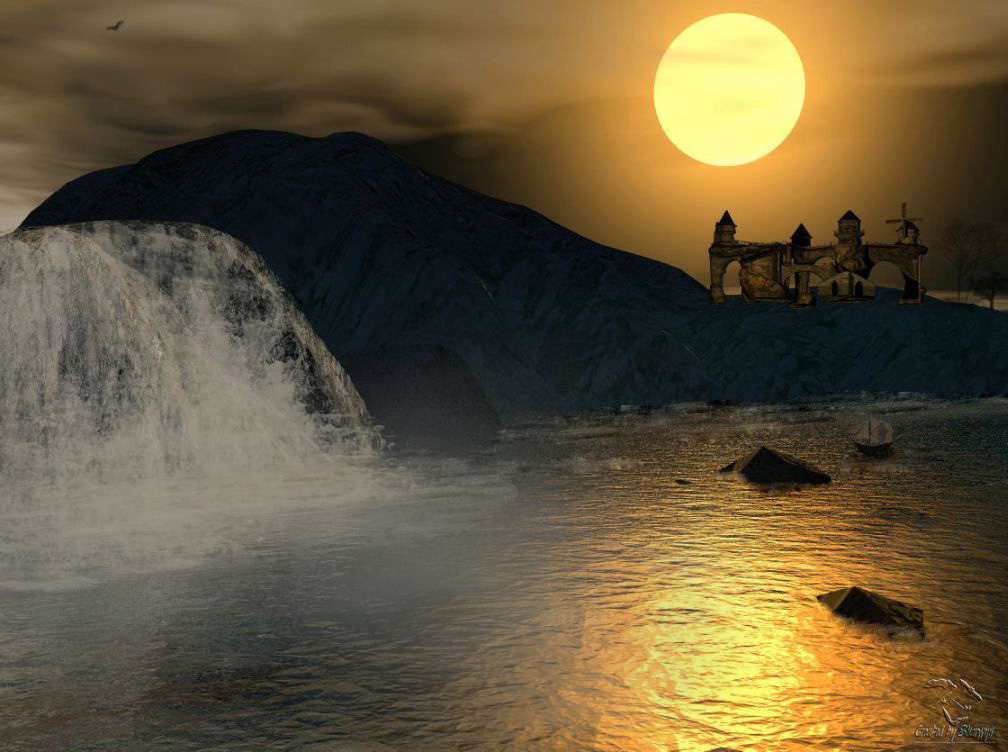 Nach 36 std rendern in Bryce mit Unterbrechung , weil die Wasserfalltex so renderintensiv ist und anschließendem leichten PW mit Photoshop endlich fertig .