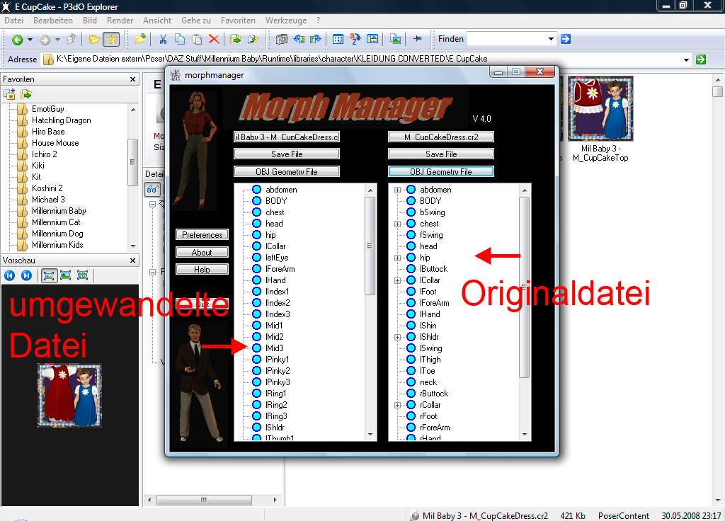 Ich habe mit dem Cross Dresser ein Kleidungsstück von Preschool für MillBaby umgewandelt. Der Cross Dresser nimmt aber keine Morph's mit d. h. ich muß die Morph's von der Originaldatei in die umgewandelte Datei kopieren. Das kann man ja mit dem Morph Manager machen. Nur meine Frage ist jetzt wie kopiere ich die Morph's in die andere Seite also in die umgewandelte Datei?