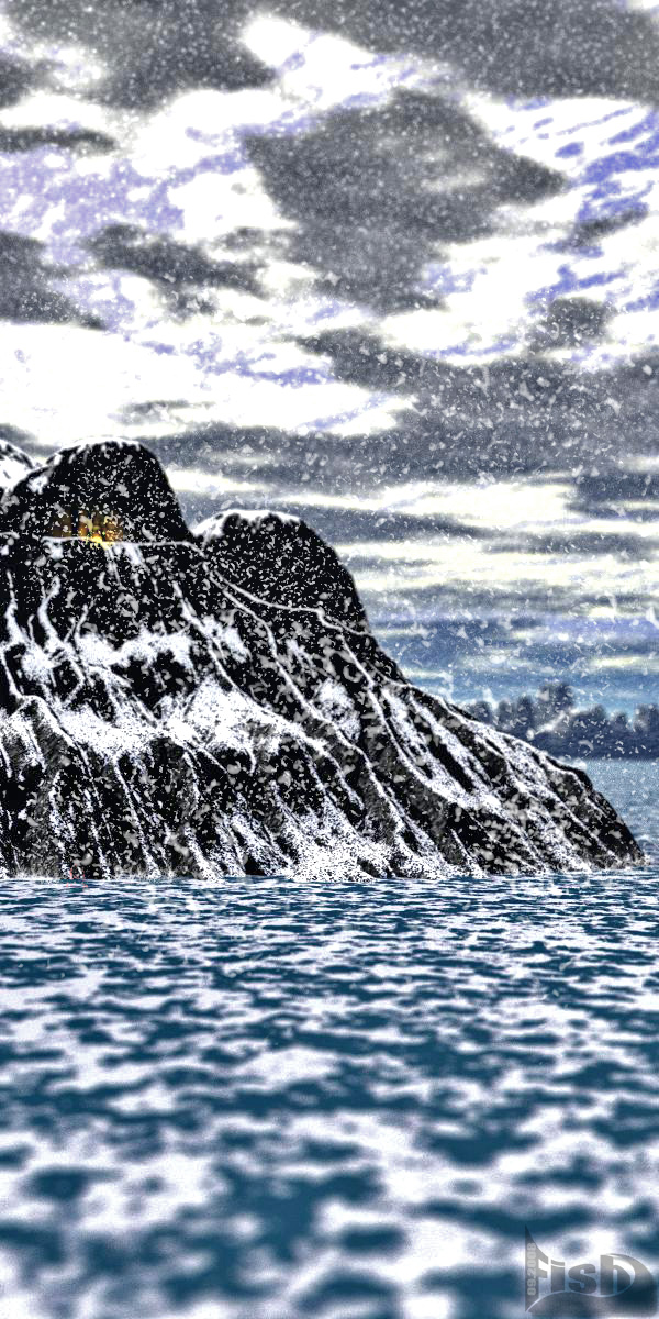 Infos: Keine Zeichen menschlicher Existenz. Oder doch nicht? Auf dem grossen Felsen brennt ein Feuer. Wo Feuer brennt ist auch der Mensch nicht weit. Möglicherweise sind es Forscher auf einer Expedition.