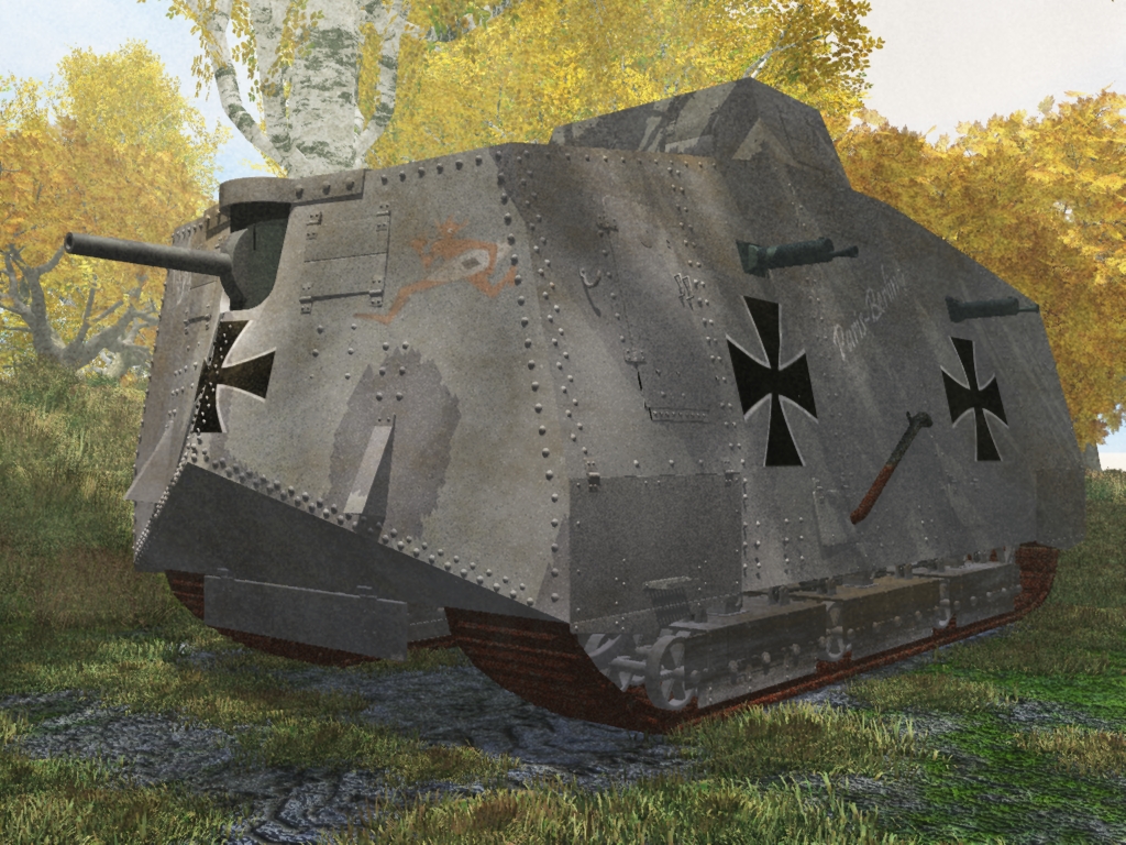 da fährt der A7V durch den herbstlichen Argonnerwald.