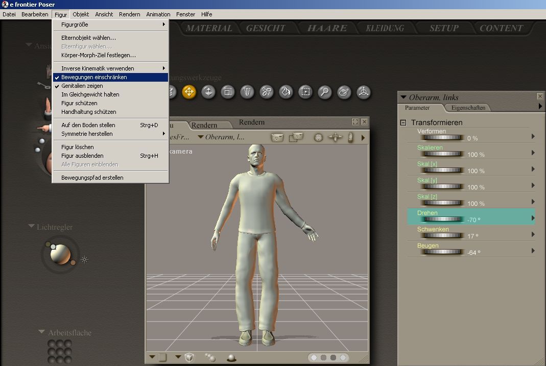 Ich habe noch nie so ein bescheuertes Interface gesehen wie das von Poser, dafür müsste man dem Programmierer eigentlich die Finger brechen. Das Positionieren bzw. das bewegen von Körperteilen ist so was von sperrig und es gibt keine Begrenzung. Im Prinzip kannst du eine Arm so lange drehen bis er aussieht wie ein Spiralbohrer.