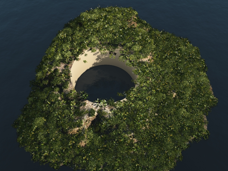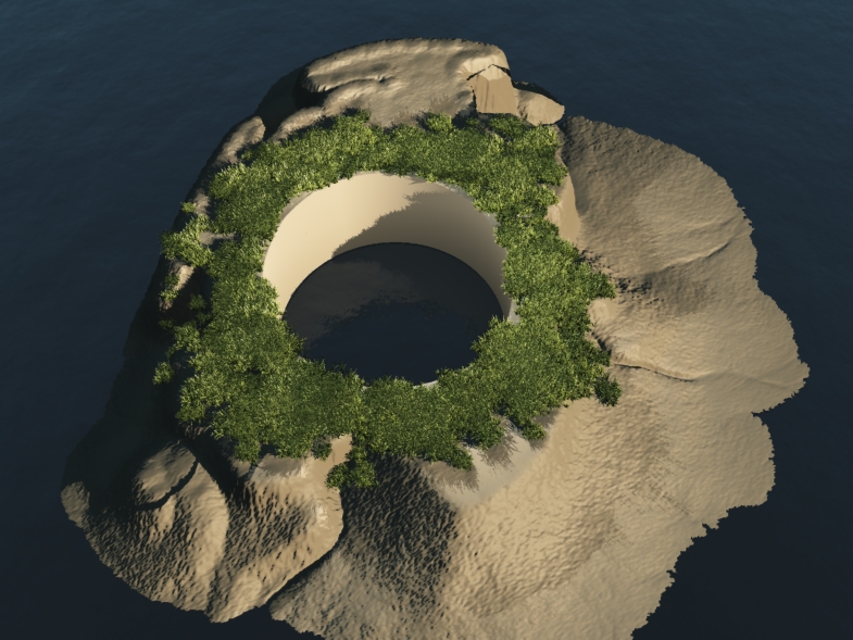 Terrain mit Zylinder geboolt und dann bepflanzt.