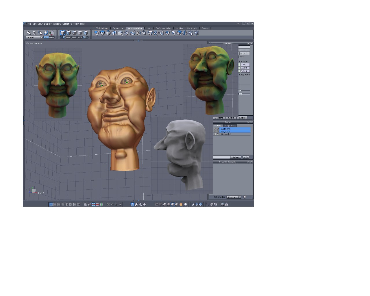 Ich bin gespannt was dabei herraus kommt. Habe die einzelnen kommponennten vormodelliert ( auge, mund, ect.) und bin dabei alles zusammen zu basteln. Ob männlich oder weiblich ???? Vieleicht was dazwischen.