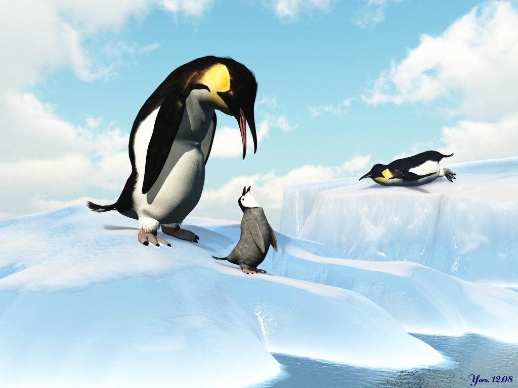 Demnach konnte ich mich auch dransetzen und was draus machen; also das Eisbergmaterial noch ein bißchen weiter bearbeiten, ein zweites Terrain einfügen und ein weiterer Pinguin durfte auch noch mit dazu.