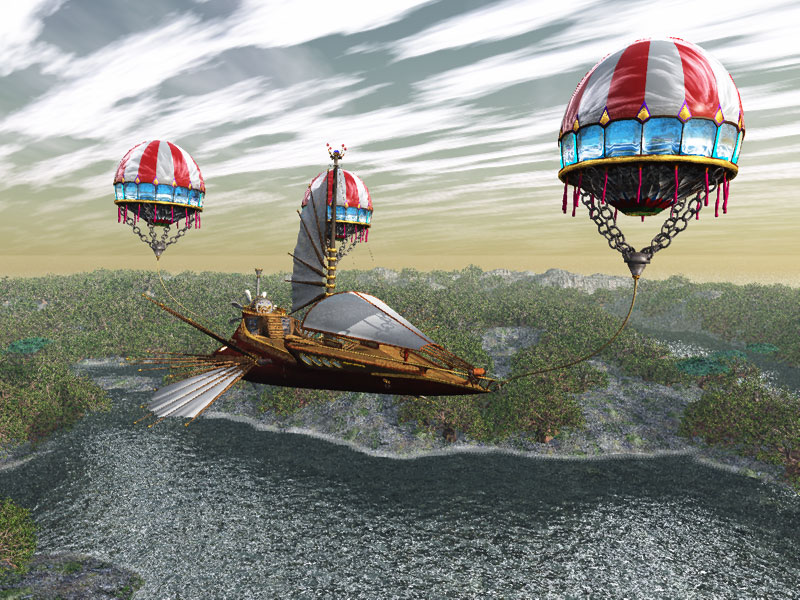 • Das Luftschiff ist wunderbar. Auch das Wasser lässt sich sehen. Nur den Himmel und vor allem die Bäume sehen irgendwie komisch aus. Aber ich weiss noch nicht an was es liegen könnte. Vielleicht an der Bildauflösung? Ist das 800x600? Ich könnte mir Vorstellen dass die Details der Bäume durch eine grössere Auflösung auch besser zu sehen wären, aber da wäre die Renderzeit...