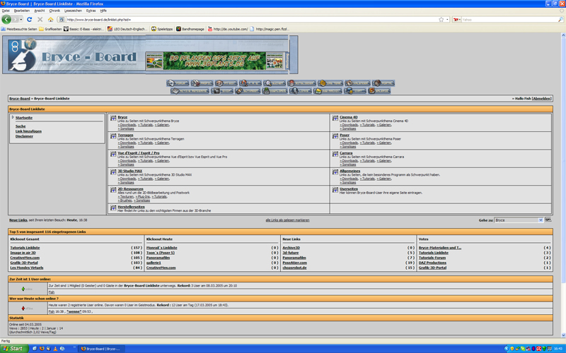 • Es soll in nächster Zeit (genauer Termin steht leider noch nicht fest!) das BryceBoard im Zuge eines Updates der Boardsoftware umgezogen werden. Das Ganze sieht dann ein Wenig anders aus und es muss vieles, auch die Linkdatenbank angepasst werden.