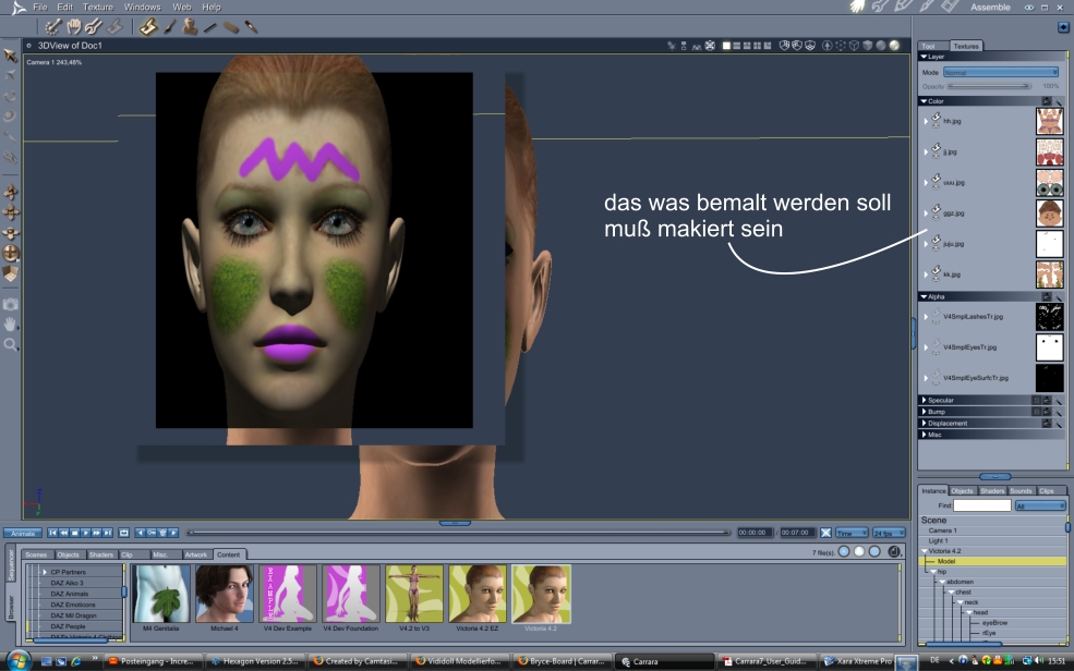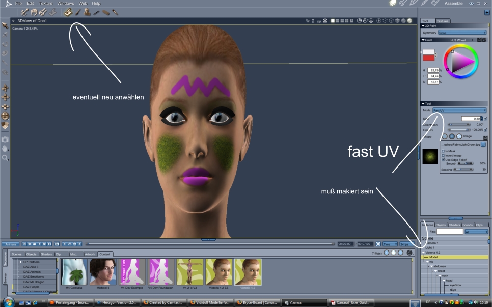 Manschmal muß ich aber extra noch mal dieTools neu anwählen oder von normal Projektion auf fast UV umschalten damit es malt .In der Hirachie muß man bei Vicky zb. "Modell" angewählt sein um sie zu bemalen .