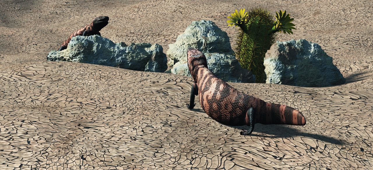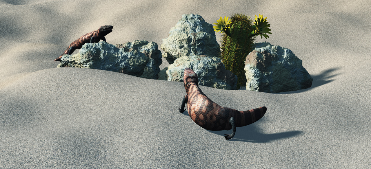 Bei dem Bild habe ich mit den bekanntermassen eher bescheidenen Vue-Steinen und Texturen experimentiert. Das Ergebnis find ich passabel. Es sind "normale" Vuesteine mit der "2 lichens desert"Textur, bei der ich ein bißchen an den Bumps und der Skalierung gedreht und displacement-mapping aktiviert habe. Renderzeit ca. 15 Min. mit externem Renderer. Der interne wollte nicht mit Verweis auf zuwenig Speicherplatz ... :rolleyes: ... Da können aber auch die grossen Texturen der Gila-Echsen und des Kaktus (alle von CP) eine Rolle gespielt haben. Das Displacement hat ihm dann wahrscheinlich den Rest gegeben.