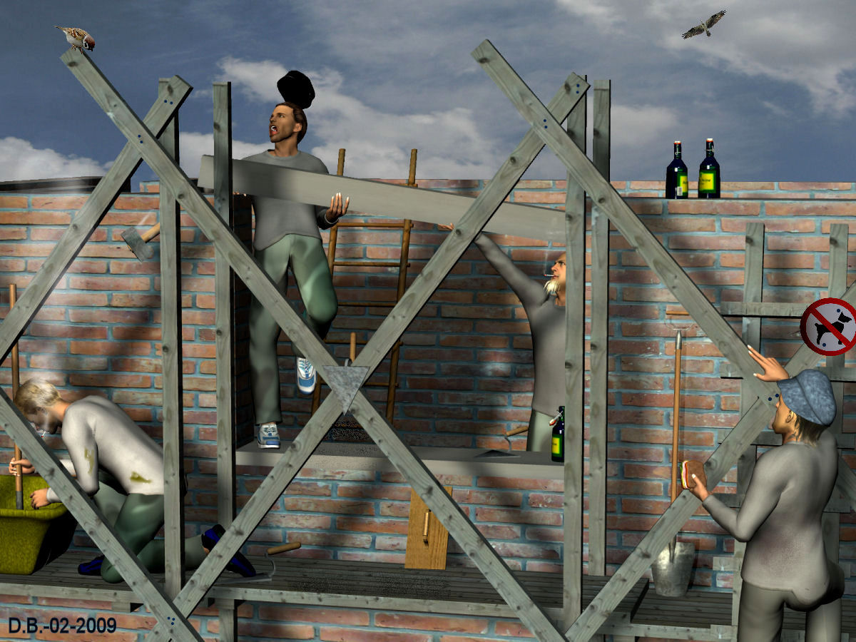 Ich hatte etwas Mühe damit, zu erkennen dass die Mauer ein Fensterloch hat. Es sah zuerst so aus, als ob der obere Typ rechts im Gerüstpfosten verschwinden würde.