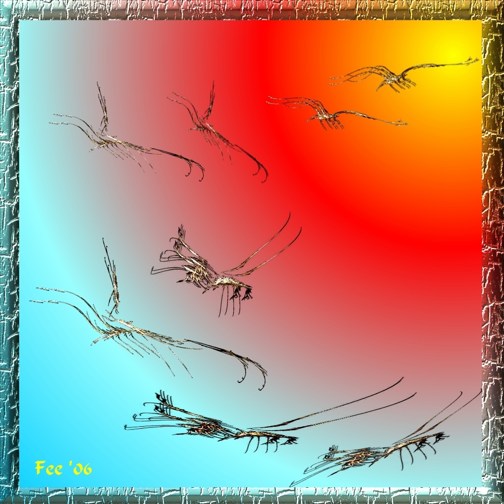 Jetzt noch ein gutes Fotobearbeitungsprogramm und ein wenig Übung im Freistellen von Objekten, das ganze dann kombinieren je nach Laune und Phantasie und schon hat man irre-tolle Kunstwerke. Das angehängte Bild ist z.B aus einem Apophysis-Flame entstanden, das ich mittels Farbmaske ausgeschnitten habe, dreimal leicht versetzt übereinander angeordnet und heraus kam dann dieser insektoide Alienkopf.