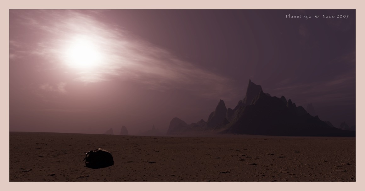 Marsähnlicher Planet mit sehr dünner Atmosphäre, dennoch bringen die Temperaturunterschiede sehr heftige Stürme hervor. Die verschleierte ferne Sonne läßt den nächsten Sandsturm schon erahnen. Stimmige Szene.