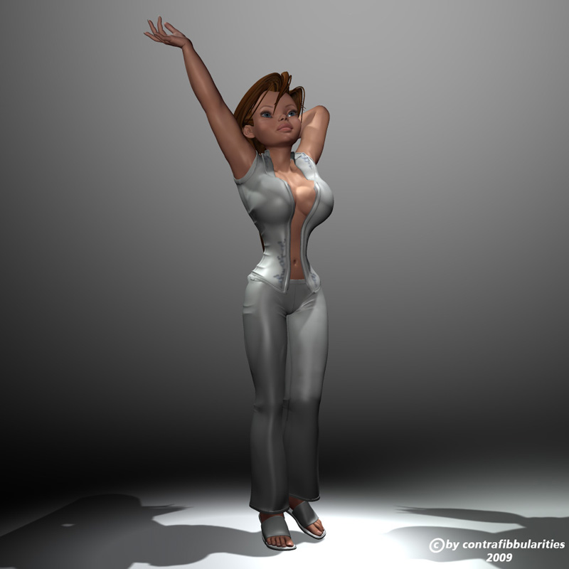 Ich kann Euch gar nicht sagen, was dieser Pipikram an Zeit gekostet hat. Dass ich ewig gebraucht habe, um die Kleider an die Pose anzupassen, ist nicht verwunderlich, ich arbeite fast gar nicht mit Poser, da dauert sowas schon mal ein paar Stunden länger. Was frustrierend war, ist die Tatsache, dass ich nicht annähernd das machen konnte, was ich an Beleuchtung/Renderqualität haben wollte. Abstürze, Artefakte, etc. etc. Eigentlich zuviel Zeit für zuwenig Ergebnis. Ich hoffe, irgendjemand hat Mitleid und schenkt mir einen neuen PC. :D