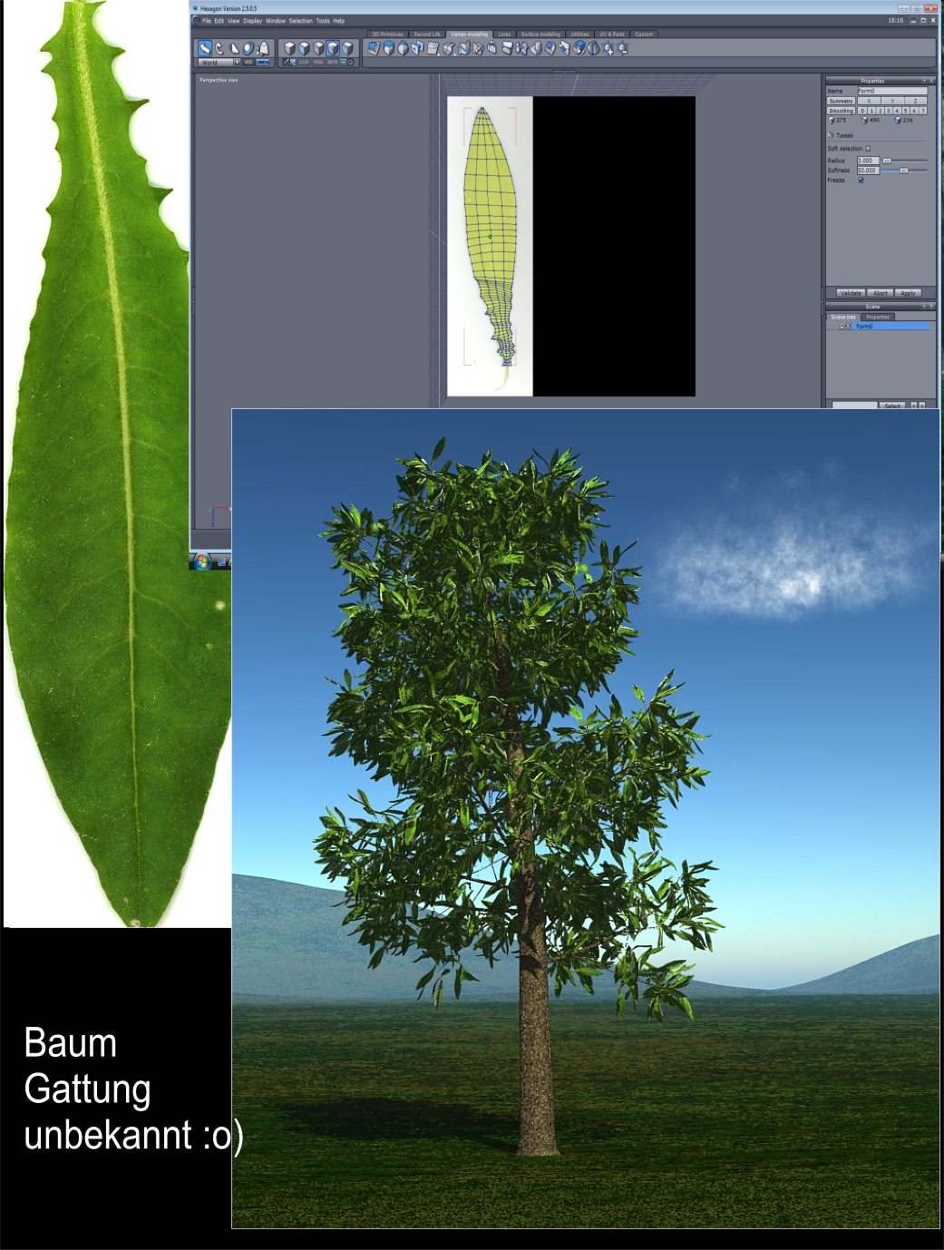 Ich habe dazu ein Real-Blatt von irgendeinem Busch(keine botanischen Kenntnisse) auf meiner Terasse abgezuppelt und das durch den Scanner gejagt, um das als Vorlage für Hex und gleichzeitig als Textur zu verwenden. Na da werde ich morgen mal Laub sammeln gehen .... ![]()