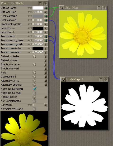 Für deine Blume müsstest du also in einem Bildbearbeitungsprogramm eine 2. Datei anlegen, wo der Hintergrund schwarz ist und die Blume weiß. Im Materialraum stöpselst du diese Transmap bei Transparenz und Transparenzgrenze ein. Jeweils den Wert 1 einstellen.