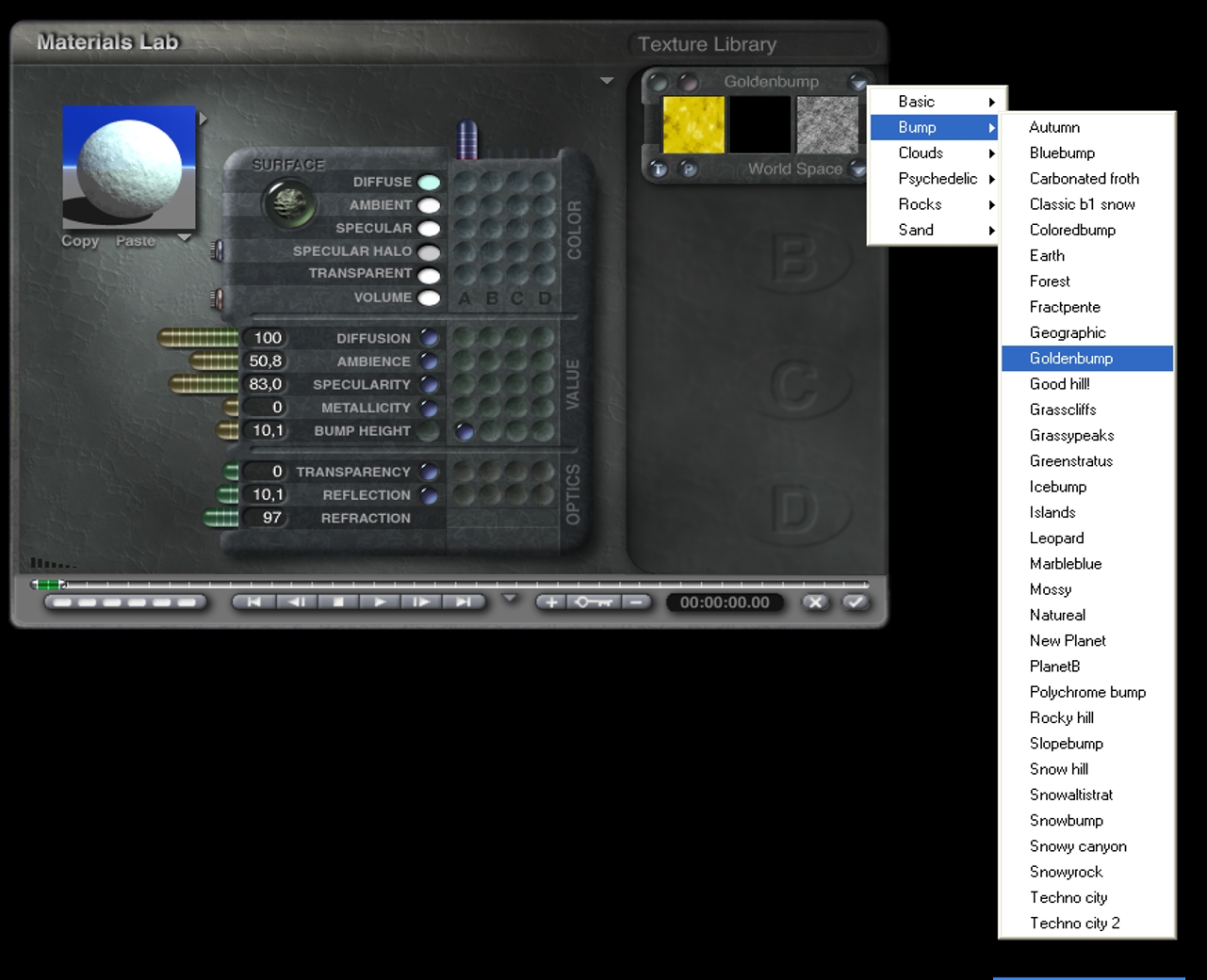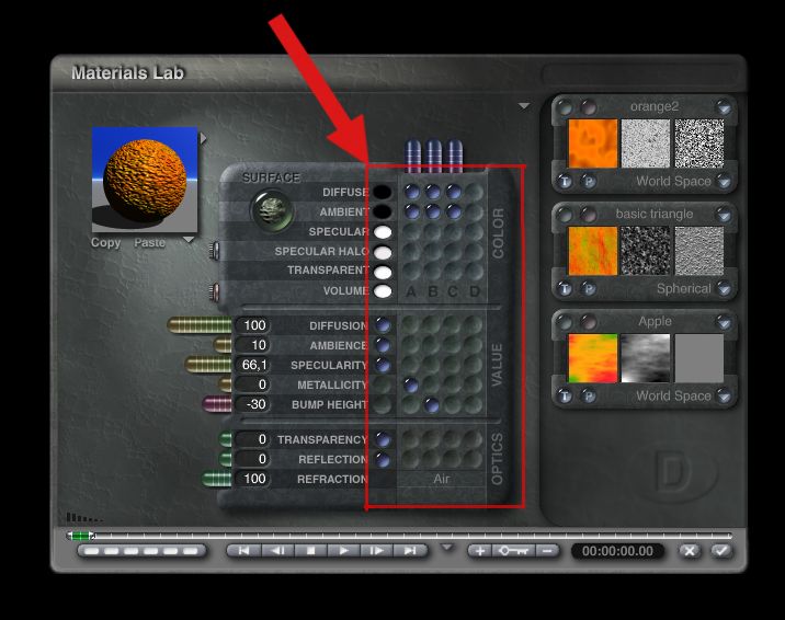 hier findest Du die Dinge wie Specularity, Ambience, Diffuse (Markierung). Jedes Material kann hier verändert werden und auch als eigenes abgespeichert werden. Man kann auch ganz eigene Materialien entwerfen und auch Bildtexturen verwenden - irrsinnig vielseitig.