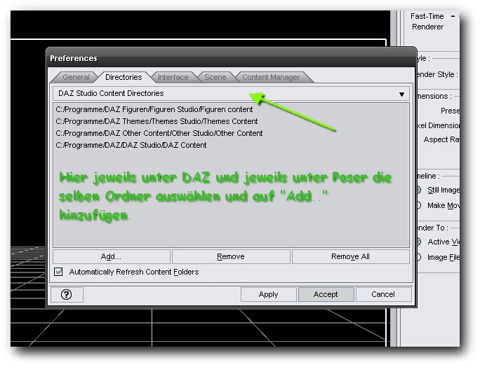 In DAZ kannst Du dann über "Edit", "Preferences" und dort im Tab "Directories" jeweils den DAZ Studio Ordner und den Poser Content Ordner hinzufügen. Wenn es zu viele werden wieder deaktivieren und nur rein nehmen, wenn er auch gebraucht wird. Durch diese Sortierung wird links der Content-Tab übersichtlicher. Aber jeder wird seine eigenen Wege gehen.