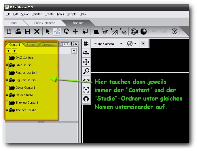 Beim Installieren von Content wird nur der Installationspfad entsprechend angepasst. So kommen alle Personen, Bekleidung etc. in den Ordner "Figuren Content"; Gebäude, Landschaften etc. in den Ordner "Themen Content" usw.