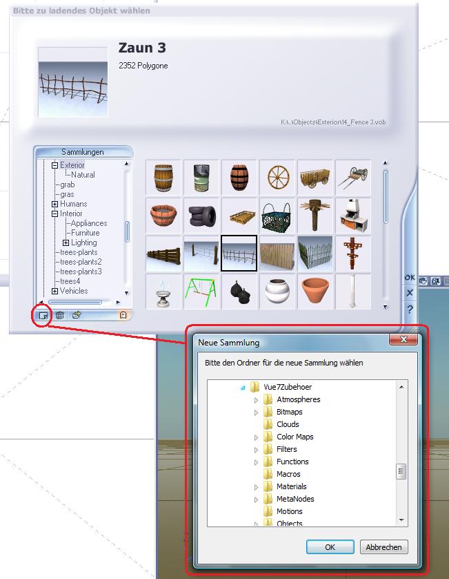 Du musst nicht immer jedes neue Objekt neu in die Sammlung bei Vue hinzu fügen! :rolleyes: Schieb es einfach mit allen wichtigen Dateien (*.vob = das Objekt - oft sind dann noch die Texturen als *.jpg oder *.bmp nicht in das *.vob eingebunden und liegen extra mit in der *.zip und müssen neben dem Objekt in den selben Ordner.) in den Ordner und es erscheint bei nächsten Öffnen der Sammlung.
