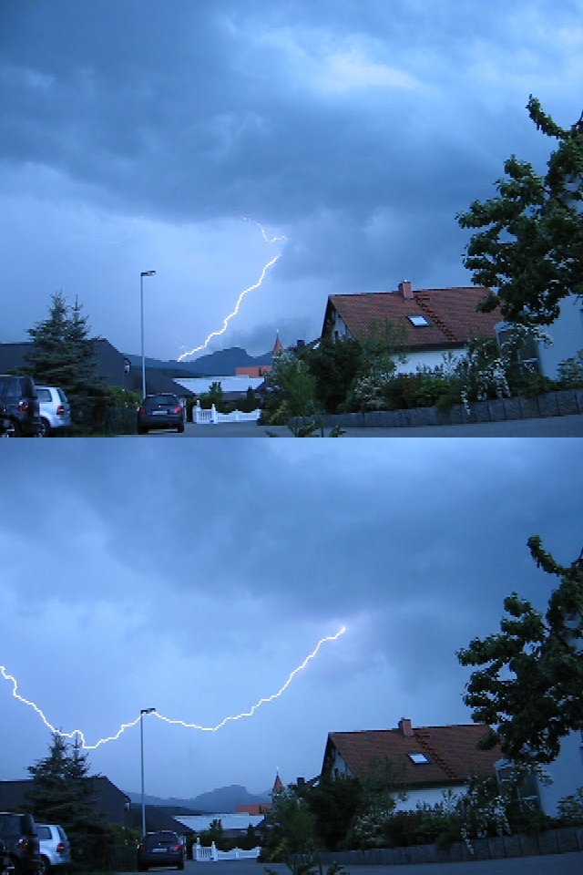 Schon immer hab ich mir überlegt, wie ich mit einfachen mitteln Blitze fotografieren kann, man sieht daß die Bilder auch keine tolle (eine Sche..) Qualität haben, ich hab einfach meine Digitalkamera auf's Stativ gesetzt, auf Videomodus umgeschalten und dann minutenlang laufen lassen, danach hab ich mit einem Videoschnipsel-Programm die Bilder als Einzelbild rausgeschnitten.