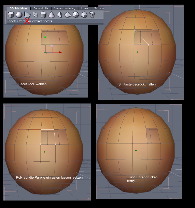 Im Punktemodus Facet Tool wählen und Shifttaste drücken dann rastet das genau auf die Punkte ein wo du das haben möchtest. Es zeigt dir dann auch (weiße Line)an wie dein Polygon ensteht. Wenn Poly fertig gesetzt ist Enter drücken.