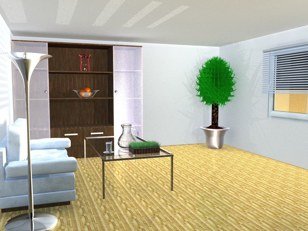 zum Renderproblem bei AoI kann ich nix sagen, weil ich nicht damit arbeite. Das Mapping des Bodenbelages müsste geändert werden, das tiling sieht nach ungünstiger Parametereinstellung aus. Der Baum in der Ecke wirkt doch sehr abstrakt. Das Licht kommt gut, wenngleich etwas grell in der Reflexion... :)