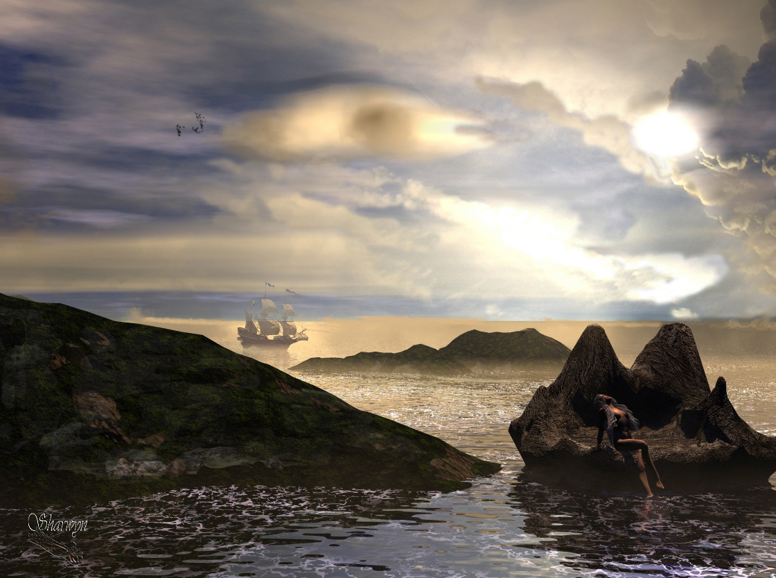 in zwei Versionen :gearbeitet ist das ganze in Bryce , Figur mit Stein aus Poser importiert, Nachbearbeitung mit PS , bei Version 2 Anwendung eines Filters aus PI .