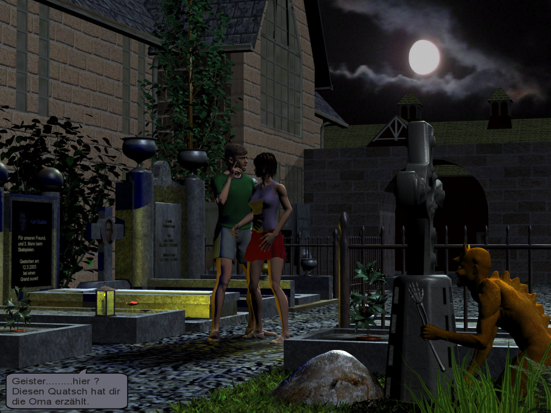 Sogar die Sprüche auf den Grabsteinen sind gut zu lesen. Nur eine kleine Sache habe ich anzumerken, ich finde dass die Pflanzen links etwas plastisch aussehen (die Blätter wirken so "statisch" und etwas unnatürlich). Aber ist nur eine Kleinigkeit; insgesamt: Klasse