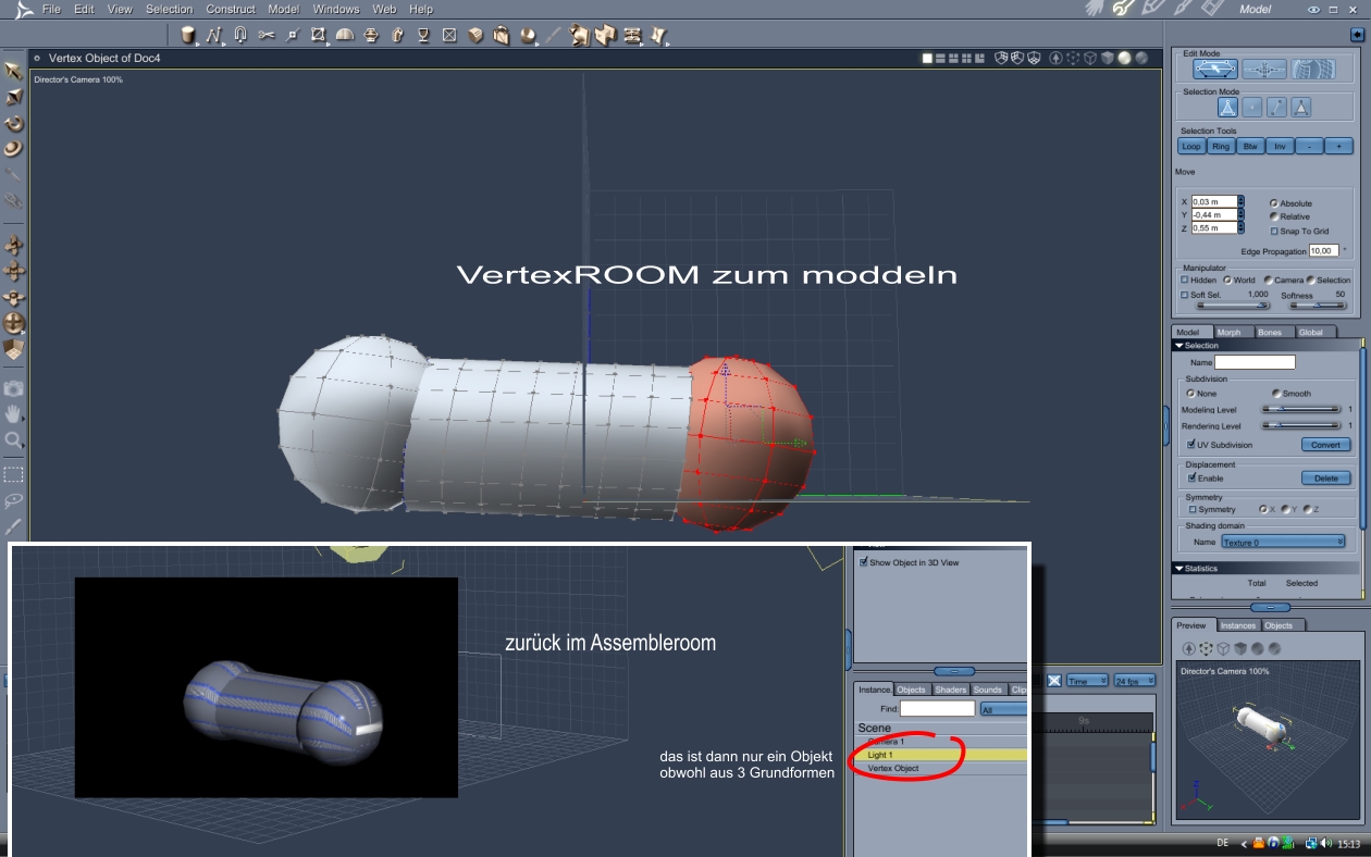Der Vetexroom ist ja wie ein externer Modeller mit einigen an nützlichen Modelliertools sowie Morp- und BoneEditor und auch zum UV Maps erstellen Solltest du Version 7 pro haben kannst du aber auch im Assembleroom an deinem Objekt arbeiten.