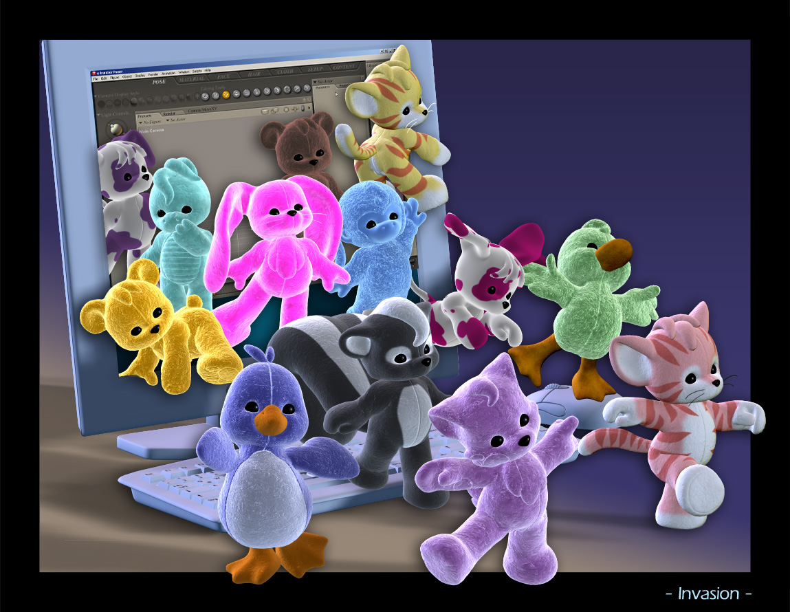 Ich frage mich manchmal Abends auch, was da nachts so raus kommt, wenn mein PC so vor sich hin rendert. Habe ja schon Monster in Verdacht gehabt. Aber Kuscheltiere sind ja noch viel besser. Einfach süß geworden Dein Bild. Tolle Idee.