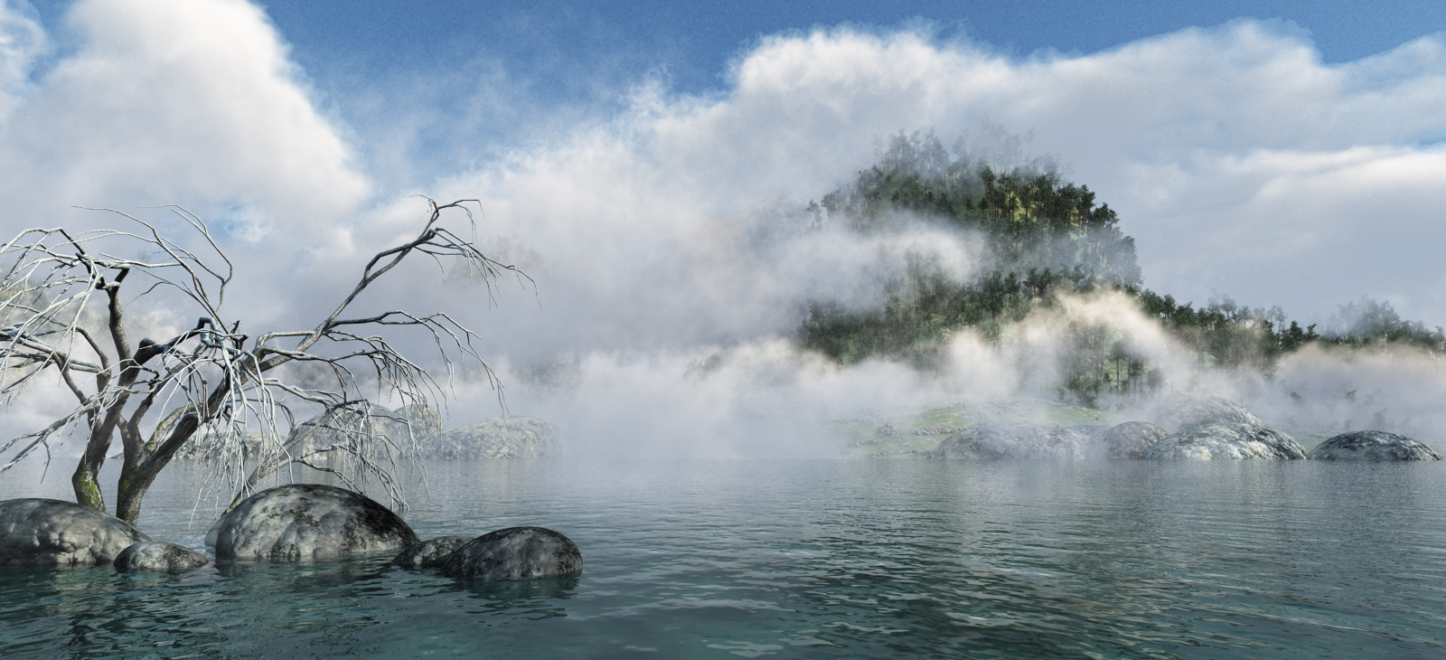 Die Bäume in der Wolke sind klasse!Kritik habe ich nur am CG-mäßigen Erscheinen des Baumes (zackig) und der Textur des nahen Felsens.
