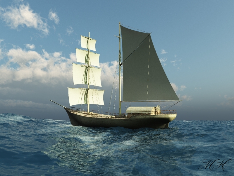 Jepp der Ozean ist klasse - das Schiff guckt ein wenig steril aus, ein paar Flecken auf den Segeln würde gut aussehen zum Beispiel und einen Mann an das Steuerrad stellen, nur so als Anregung.
