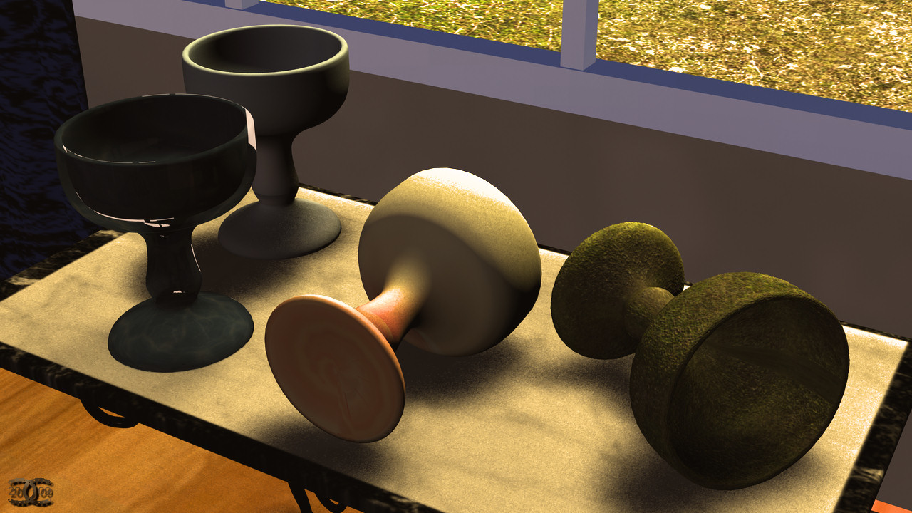 • Mal ein erster Testlauf mit verschiedenen Oberflächen. Die sind z.Z. auch nur in DAZ-Studio "raufgeschludert" worden. Das "vergammelte" Glas ganz rechts mal mit einer leichten displacement-map.