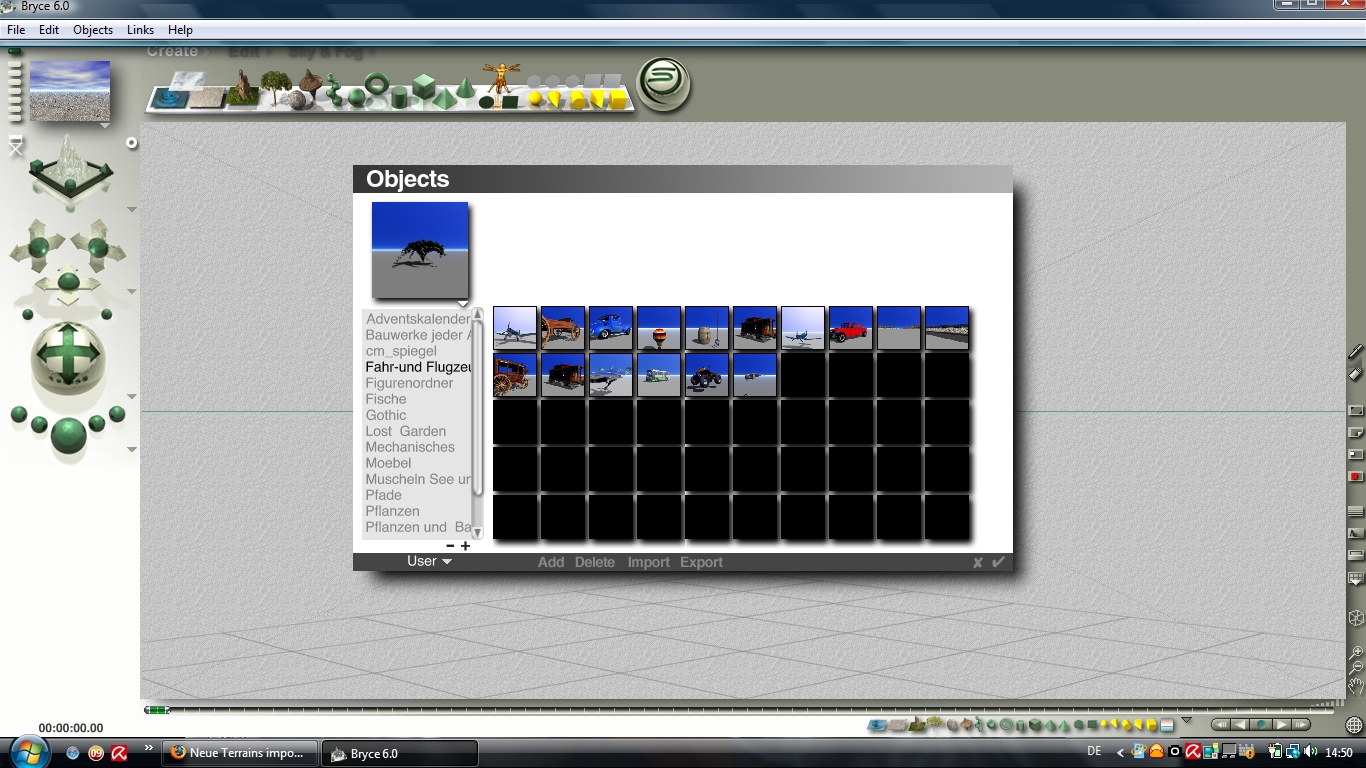 Da musst du in Bryce das Bibliotheksfenster aufrufen und dann unten auf Importieren klicken.